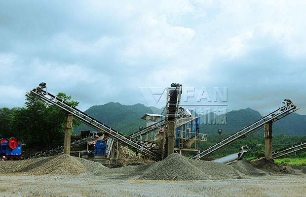我國河卵石資源眾多,因地而異。因此在配置設(shè)備時,要把方案的耐磨性性放在第一位。粒度大的可參考花崗巖與玄武巖的破碎;粒度小的需進行預(yù)篩分,以降低生產(chǎn)成本; 以200mm以下河卵石為例:物料在原料倉經(jīng)由給料機、皮帶機輸送至1#振動篩進行預(yù)篩分,大于40mm的物料進入圓錐破進行破碎,5-40mm的進入立式?jīng)_擊破碎機進行破碎,0-5mm的進入洗砂機清洗后直接出成品。圓錐破破碎后的產(chǎn)品上2#振動篩篩分,大于40mm的返回圓錐破重新破碎,形成閉路循環(huán),小于40mm的進入立式?jīng)_擊破破碎。立式?jīng)_擊破出來的料上3#振動篩篩分,大于20mm的返回立式?jīng)_擊破進行破碎,形成閉路循環(huán),小于20mm的物料經(jīng)由皮帶機輸送至成品料堆,根據(jù)原料的潔凈程度可考慮將0-5mm的物料送至洗砂機清洗。