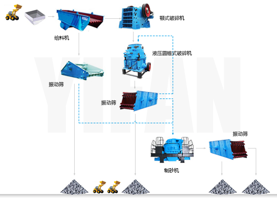 石料由振動給料機均勻地送到顎式破碎機進行粗破,粗破后的物料由膠帶輸送機送入到粗碎圓錐破進行進一步破碎,破碎后的物料被輸送到振動篩進行篩分,達到成品粒度要求的物料通過膠帶運輸機輸送到成品料堆;未達到成品粒度要求的物料從振動篩返回中碎或細碎圓錐破加工,形成閉路循環。成品粒度可按用戶的需求進行組合和分級。