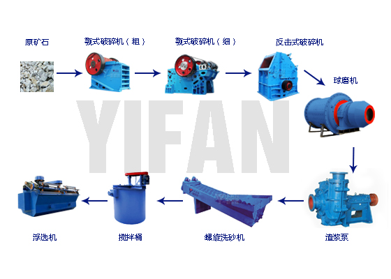 銅礦選礦生產線一般采用比較簡單的流程,經一段磨礦,細度-200網目約占50%~70%,1次粗選,2~3次精選,1~2次掃選。如銅礦物浸染粒度比較細,可考慮采用階段磨選流程。處理斑銅礦的選礦廠,大多采用粗精礦再磨—精選的階段磨選流程,其實質是混合—優先浮選流程。先經一段粗磨、粗選、掃選,再將粗精礦再磨再精選得到高品位銅精礦和硫精礦。粗磨細度-200網目約占45%~50%,再磨細度-200網目約占90%~95%。 銅礦選礦流程分為三部分: 1.破碎部分:粉碎礦石過程的基本過程。其目的是原礦粉碎到適當大小,適合用于研磨一部分。? 2.研磨部分:研磨粉碎部分進一步處理礦石得到更小的尺寸是為配合浮選分離材料? 3.浮選部分:浮選過程/升級銅礦的重要過程。化學試劑將被添加到混頻器/攪拌機,使化學反應。 開采的礦石先由顎式破碎機進行初步破碎,在破碎至合理細度后經由提升機、給料機均勻送入球磨機,由球磨機對礦石進行破碎、研磨。 經過球磨機研磨的礦石細料進入下一道工序:分級。螺旋分級機借助固體顆粒的比重不同而在液體中沉淀的速度不同的原理,對礦石混合物進行洗凈、分級。經過洗凈和分級的礦物混合料在經過磁選機時,由于各種礦物的比磁化系數不同,經由磁力和機械力將混合料中的磁性物質分離開來。經過磁選機初步分離后的礦物顆粒在被送入浮選機,根據不同的礦物特性加入不同的藥物,使得所要的礦物質與其他物質分離開。 在所要的礦物質被分離出來后,因其含有大量水分,須經濃縮機的初步濃縮,再經烘干機烘干,即可得到干燥的礦物質。銅精粉品位達到45%。
